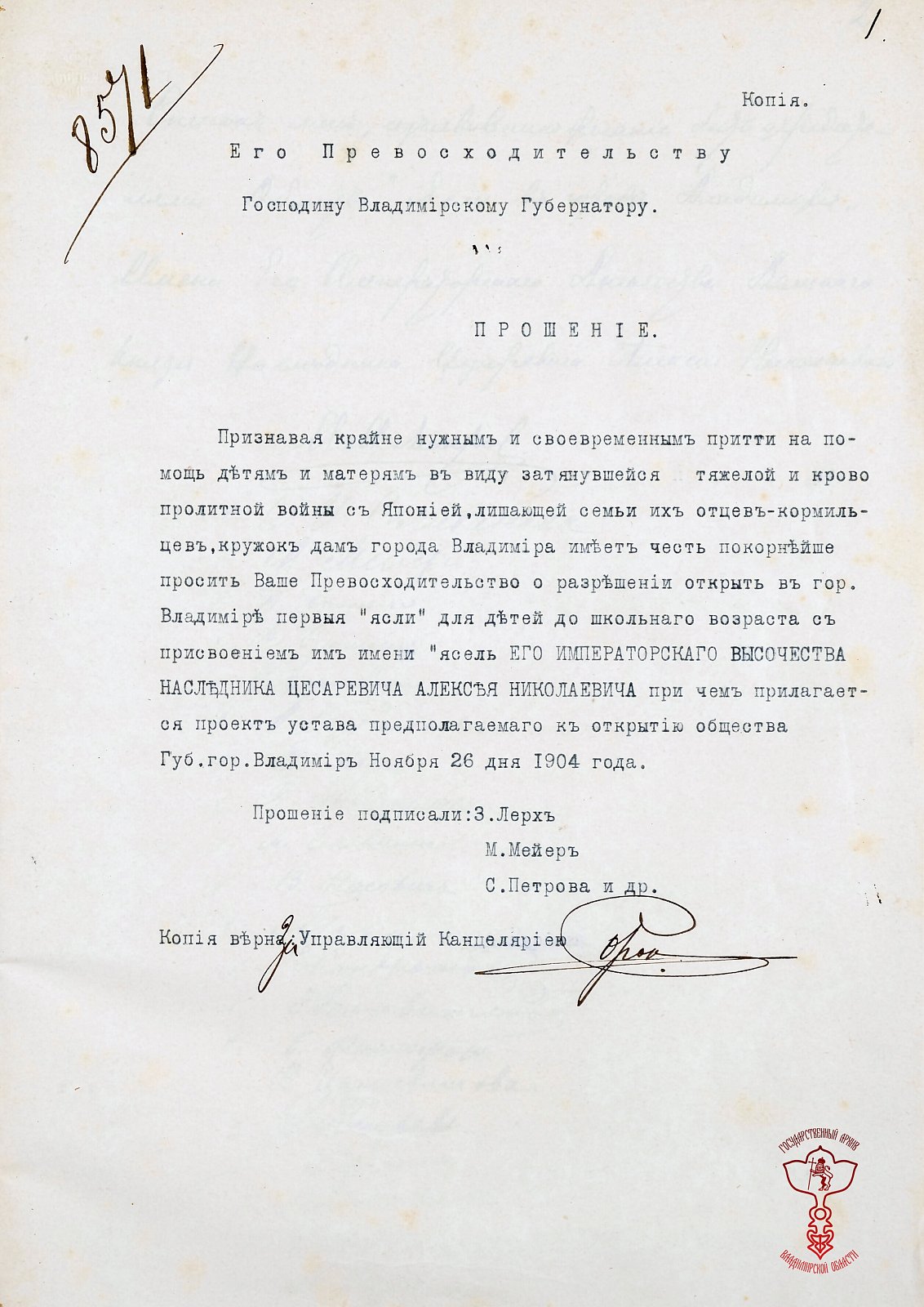 В конце 1904 г. кружок дам города Владимира решил организовать в г. Владимире первые «ясли» для детей дошкольного возраста из семей защитников родины, чьи отцы воевали на фронтах русско-японской войны.