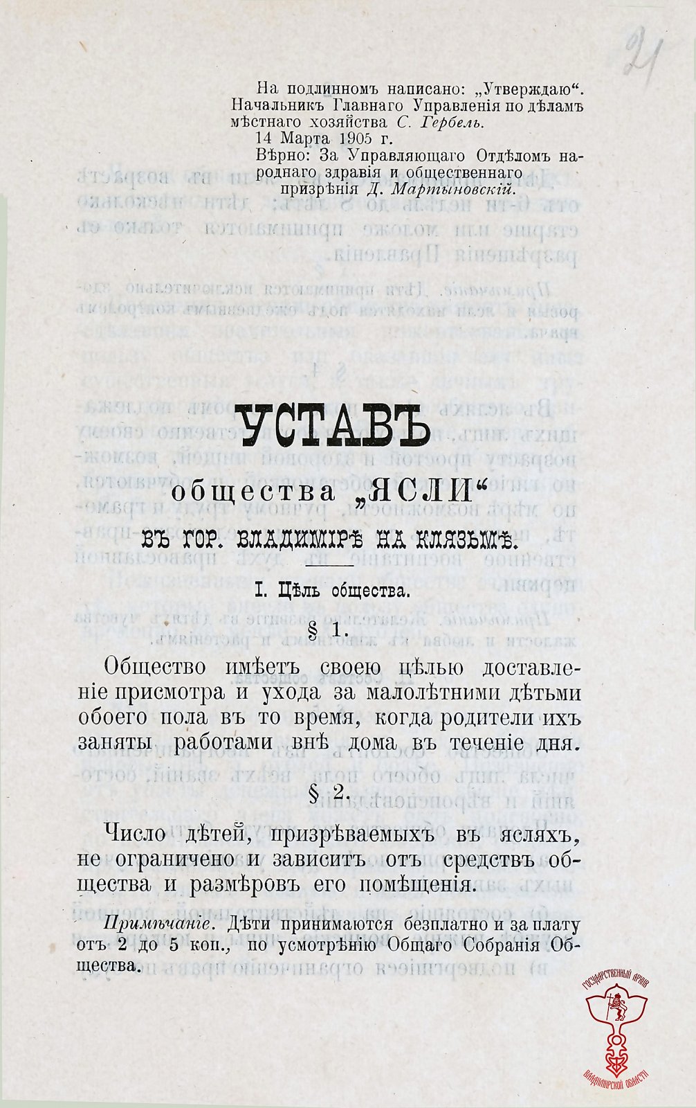 Был разработан и 14 марта 1905 года утвержден устав, по которому дети принимались в ясли в возрасте от 6 недель до 8 лет, пользовались здоровым питанием и обучались ручному труду и грамоте и религиозно-нравственному воспитанию. Дети принимались в ясли бесплатно или за плату от 2-х до 5 копеек за день пребывания.