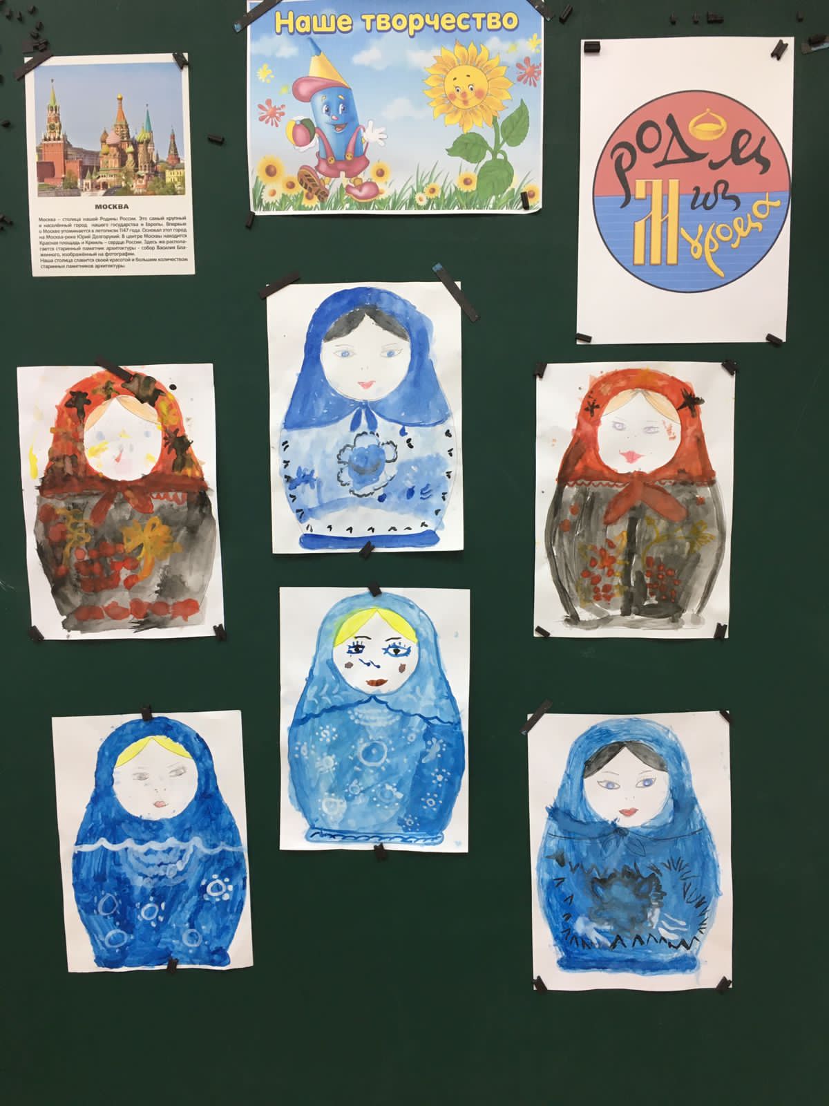 В творческой деятельности рисовали пластилином флаг России, акварелью рисовали матрешек.