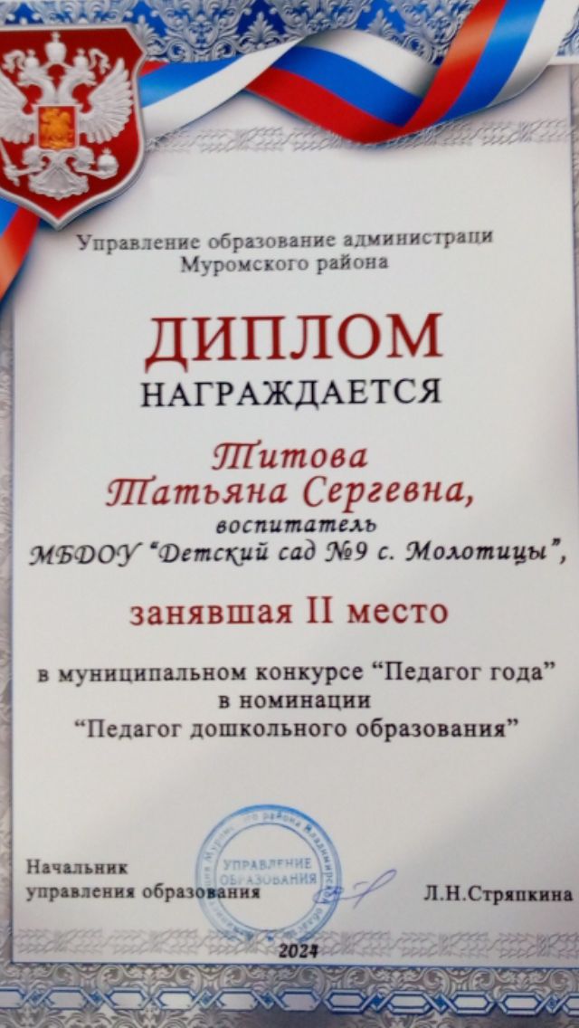 6 марта прошла торжественная церемония закрытия муниципального конкурса « Педагог года-2024». В номинации «Педагог дошкольного образования» наш детский сад представляла воспитатель Титова Татьяна Сергеевна. Поздравляем её с заслуженной наградой!!!!